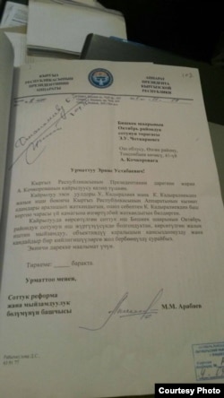 В редакцию «Азаттыка» поступила копия письма заведующего отделом по судебной реформе и законности аппарата президента Манаса Арабаева, направленное председателю Октябрьского районного суда Эрнису Чоткараеву.